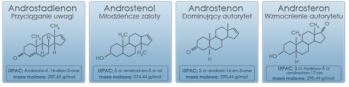 - Androsteron – u innych mężczyzn wywołuje poczucie uniżoności, u kobiet niepochamowane zainteresowanie.